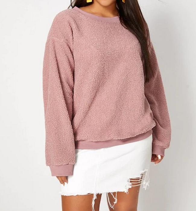 El modelo Minia es una sudadera para talla grande estilo peluche con diseño en rosa claro