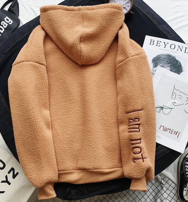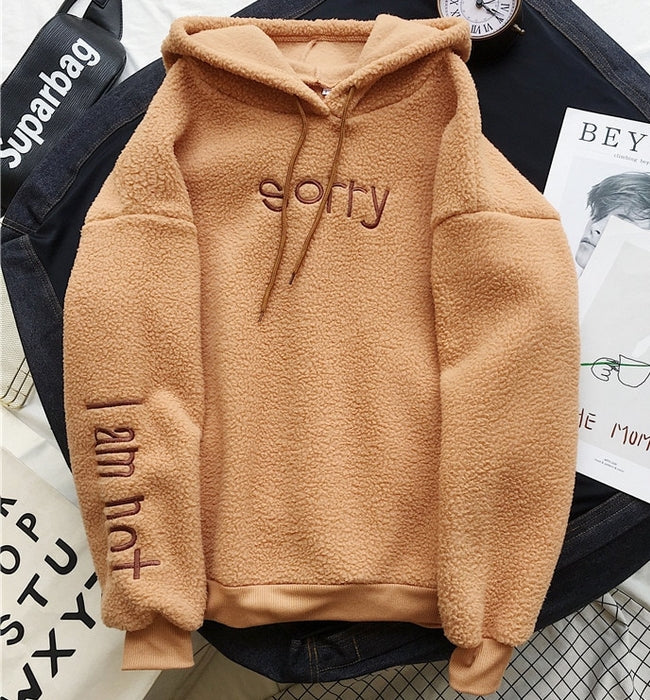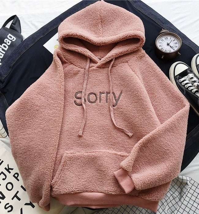 El modelo Sorry es una sudadera de pelo suave con capucha. Diseño con bolsillo y cuerda, disponible en tres colores