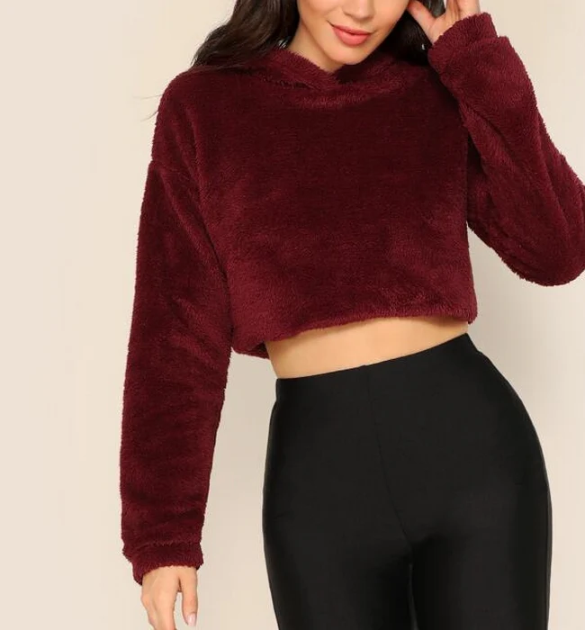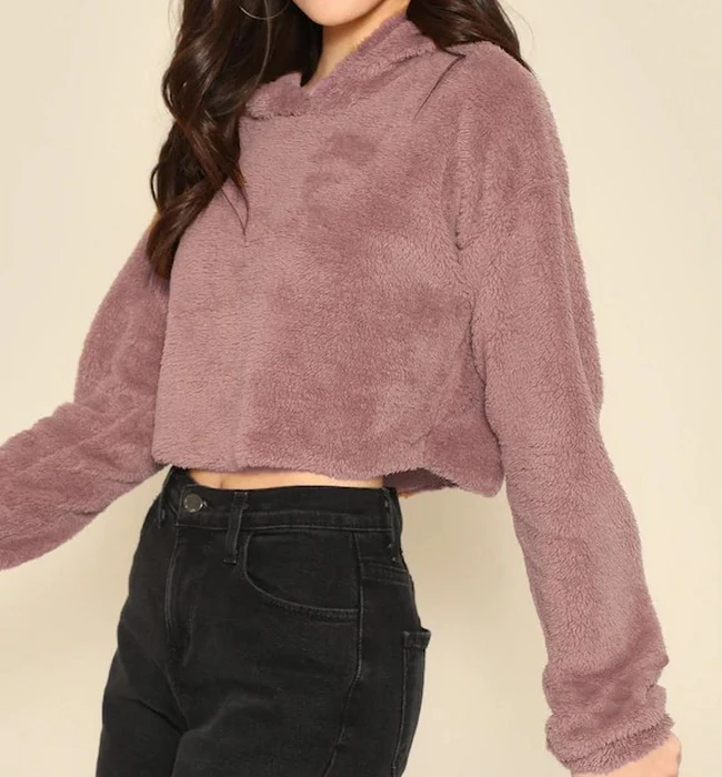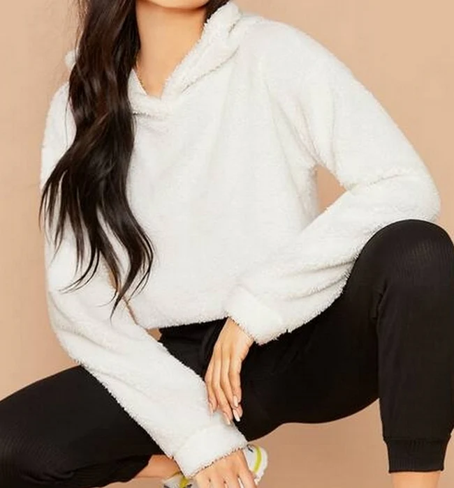 El modelo Zora es una sudadera corta de estilo peluche con capucha, disponible en tres colores